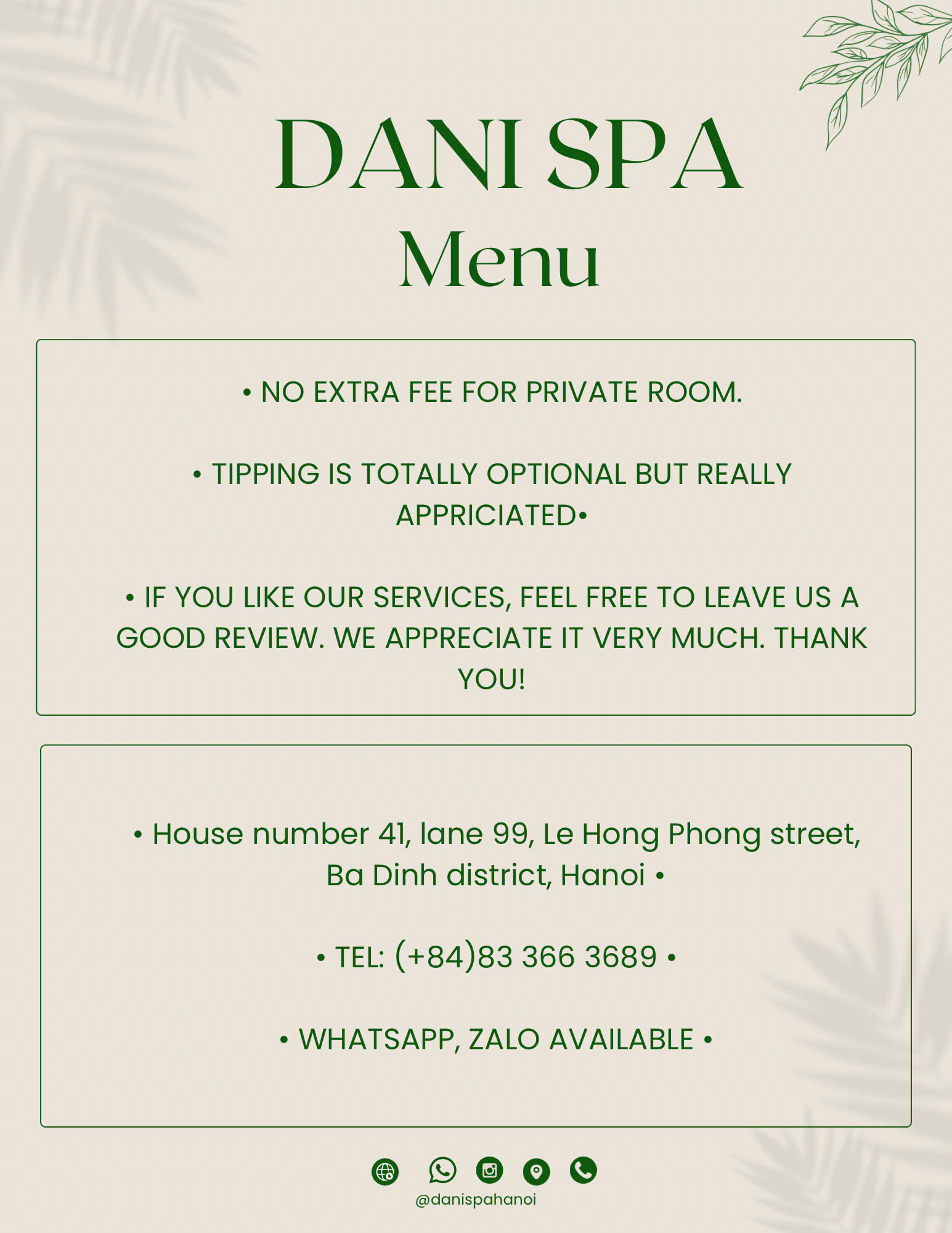 DaNi spa is proud to be a prestigious and professional spa for men in Hanoi, bringing you a comfortable relaxing environment.